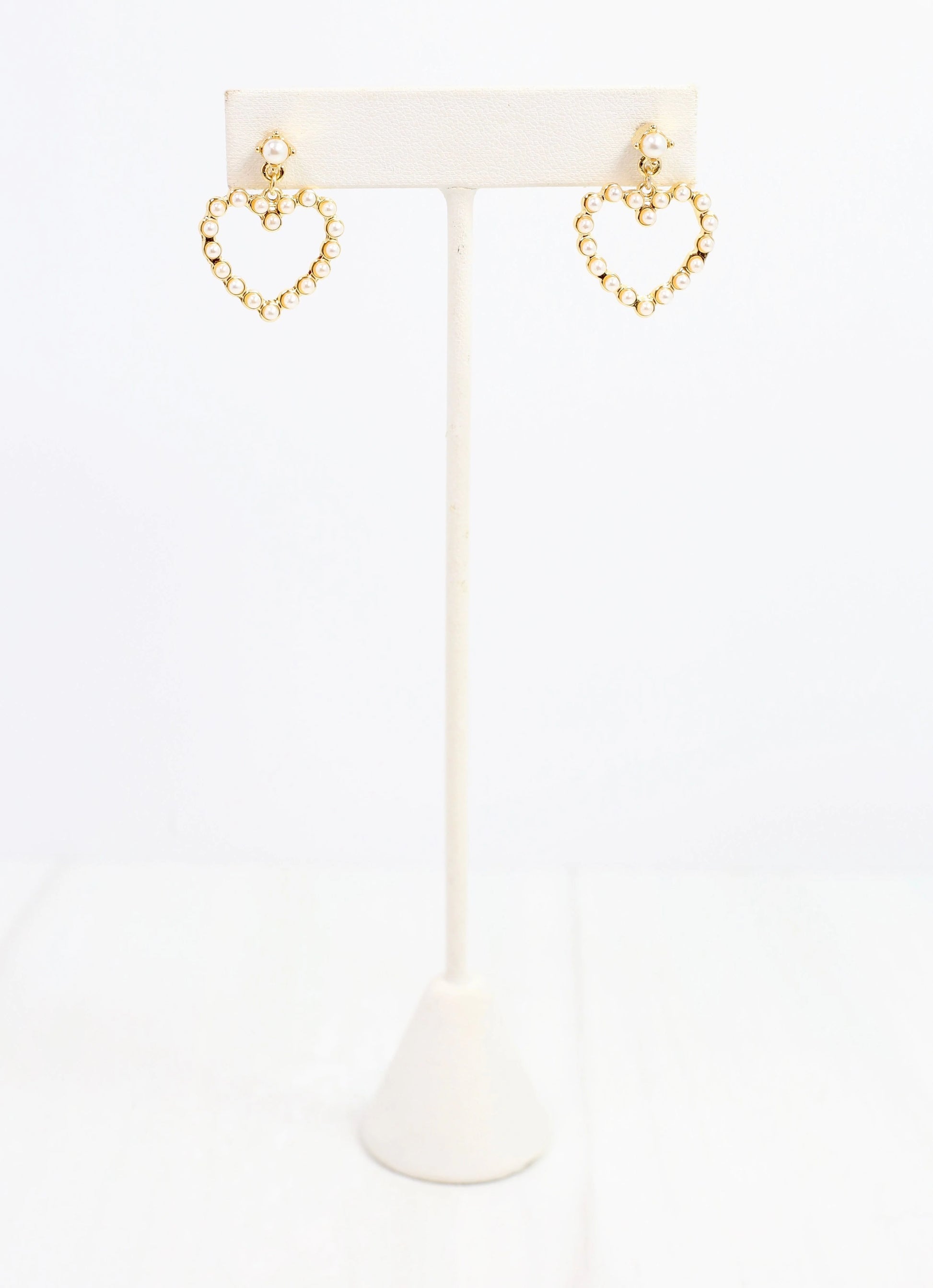 Introducing our stunning 'Love is Patient' earrings, available now on our website. This elegant open heart drop design is delicately outlined with beautiful pearls. Made with high-quality materials, these earrings are 14K gold dipped and measure 1' in length. Perfect for any occasion, these earrings are a timeless addition to any jewelry collection. Don't miss out on the chance to add these exquisite earrings to your wardrobe. Order now and experience the beauty and elegance of our 'Love is Patient' earrings.