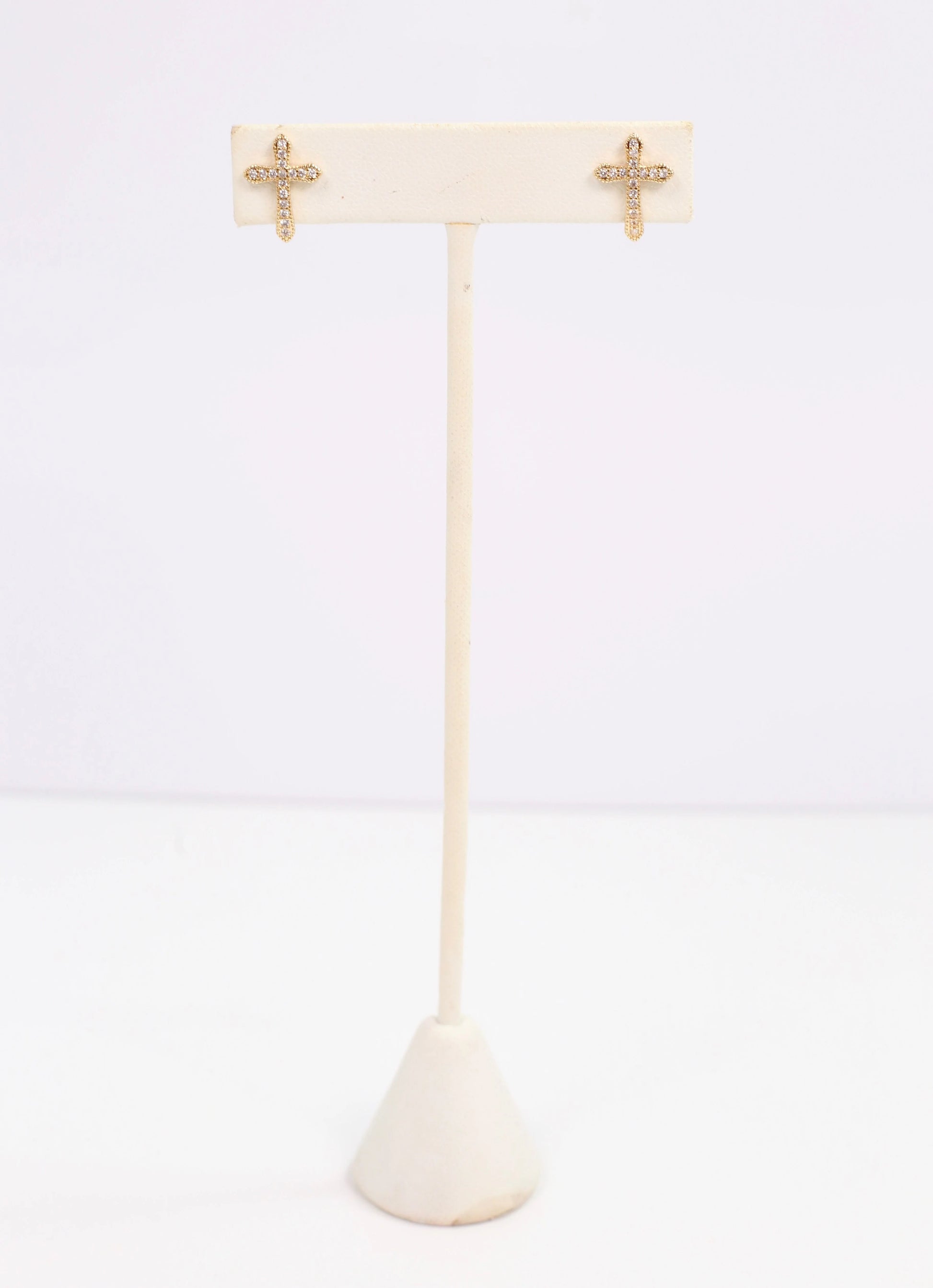 Dainty and minimal, these cross shaped stud earrings feature small rhinestones making them perfect for everyday wear. These earrings are the perfect size to be a first or upper second lobe piercing. Comes with gold backing.